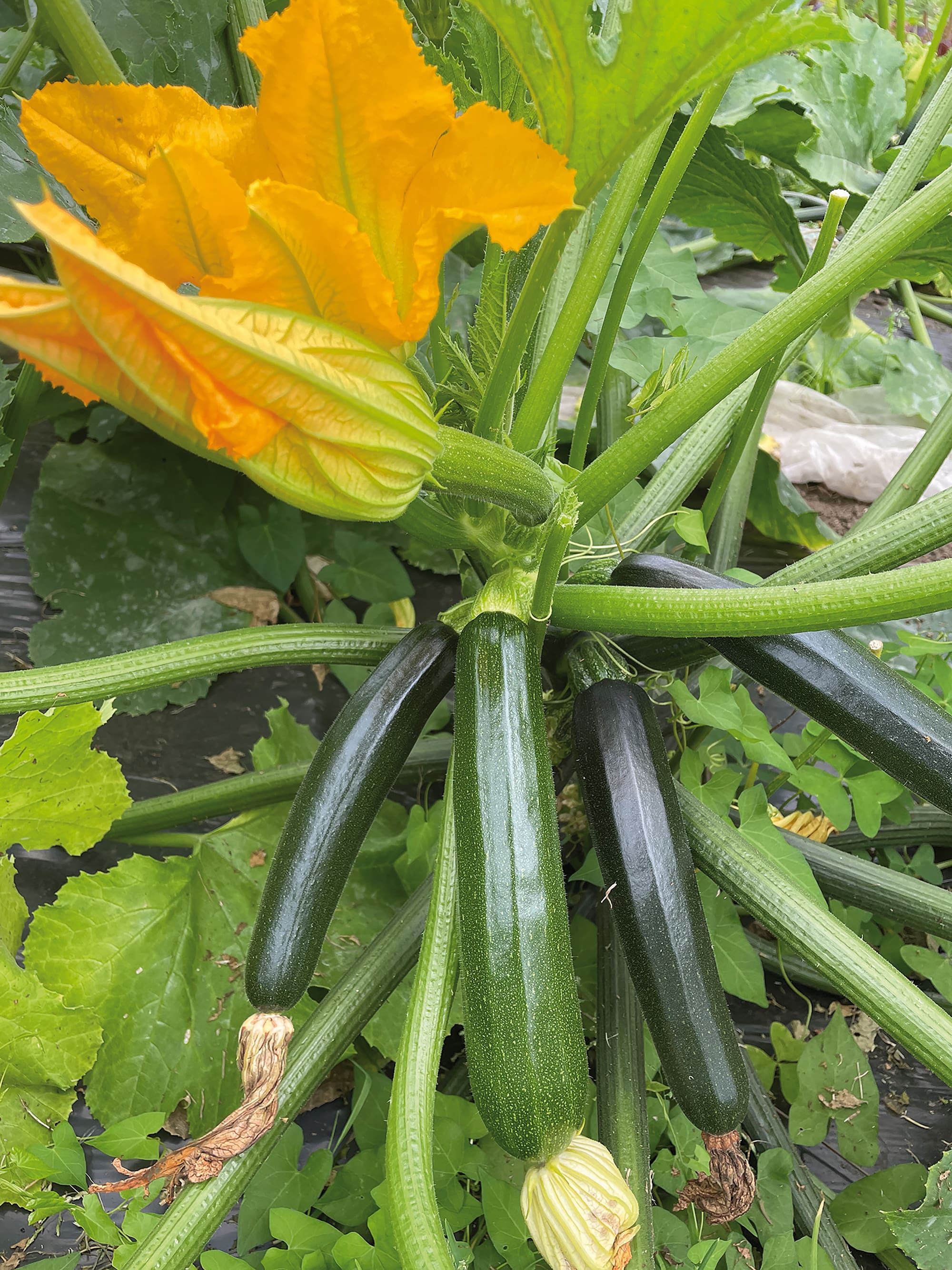 - Campo abierto: este método representa sólo 2 253 ha; se trata de una parte menor de la producción. Los rendimientos alcanzan las 36 toneladas/ha según las regiones de producción. Los calabacines se plantan al aire libre, casi siempre sobre una lona de plástico.